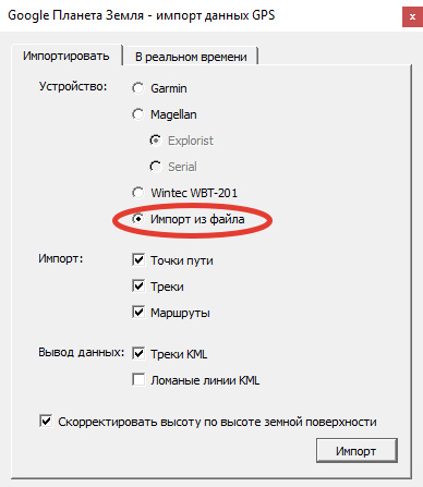 - в окне импорта трека ставим переключатель «Импорт» (рис. 8) и нажимаем на кнопку «Импорт» и выбираем ранее сохранённый файл с треком.