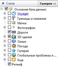 - в левом окне программы «Слои» (рис. 6) нужно убрать все галочки кроме Рельеф, Дороги и 3D-здания.