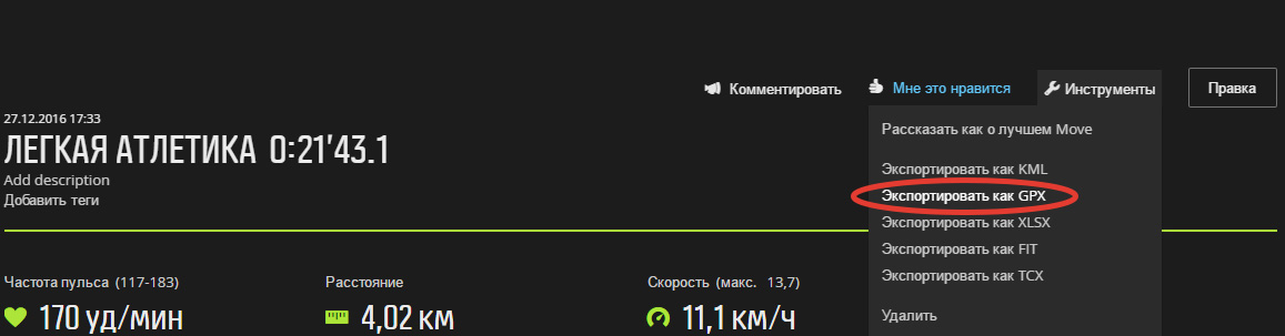 - в выбранной тренировки в левой части экрана нажать на значок с изображением ключа и выбрать пункт меню «Экспорт GPX».
