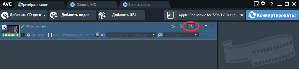 - в главном окне программы перед кнопкой «Конвертировать» выберите формат видео «Apple iPad Movie 720p TV OUT» и нажмите на кнопку «Конвертировать».