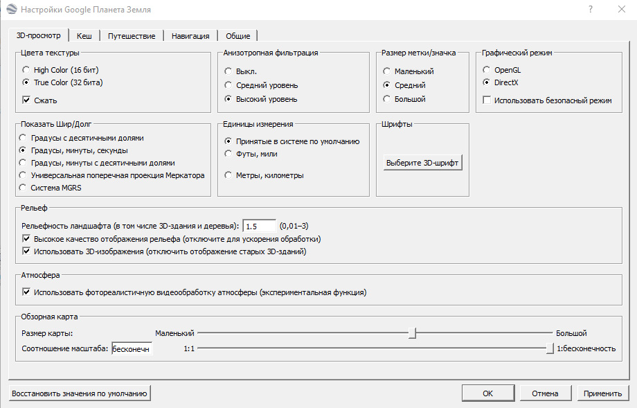 - в окне настроек во вкладке «3D-просмотр» выставить параметры как на изображении (рис. 4). Эти параметры отвечают за отображение 3д карты, при желании можете поиграться с этими настройками;