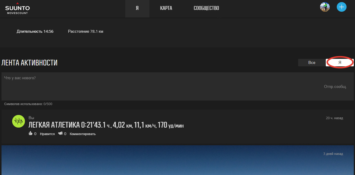 - на главной странице спуститься до Ленты активности и нажать на вкладку «Я» (рис. 1) и выбрать в списке желаемый Move (трек);
